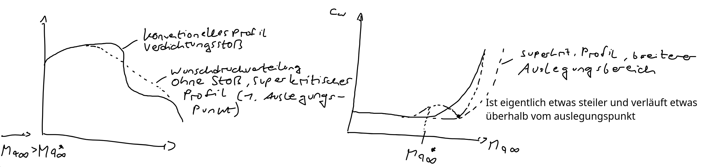 - Superkritische Profile (fliegen oberhalb $Ma_\infty^*$ ohne starke Verdichtungsstöße)