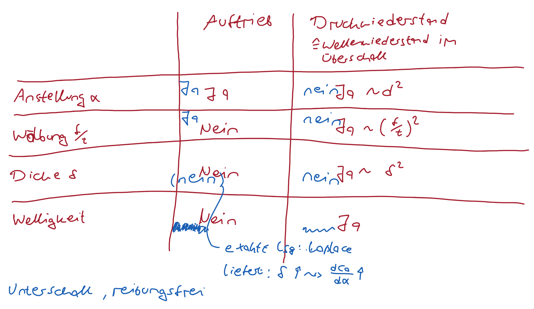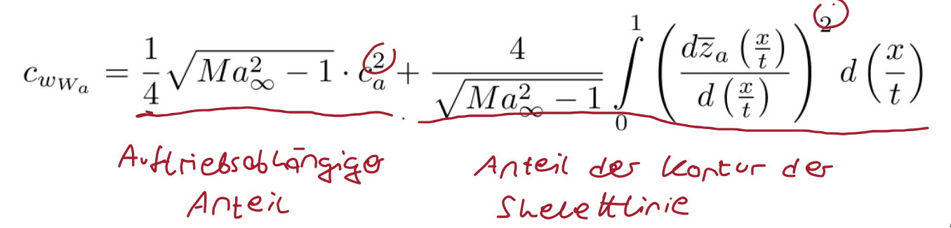 Eine Verdopplung der Wölbung des Profils geht quadratisch in den Wellenwiederstand ein, ohne einen Beitrag zum Auftrieb des Profils zu leisten (Gleichung 5.29 im Skript)